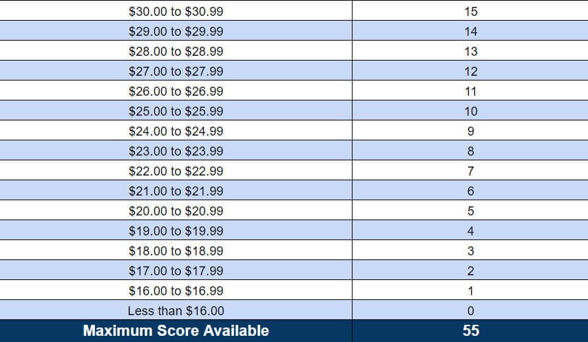 Mỗi phần của đơn đăng ký đều có điểm tối thiểu thích hợp. Ứng viên phải đạt được điểm tối thiểu trong mỗi phần để tham gia vào vòng tuyển chọn với điểm số tối đa là 200 điểm.